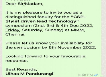 Invitation as faculty for stylet driven csp seminar at mmm-chennai december 2022