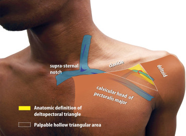 For left axillary vein access in deltopectoral triangle 30 to 60 degree anngle 1 cm below coracoid process pointing to medial cusp of triangle